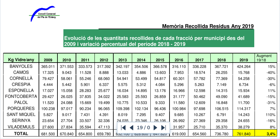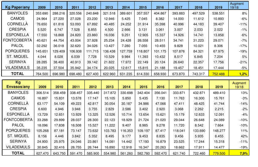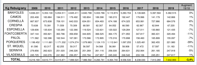 - Aquest any 2019 la generació dels residus municipals a la comarca ha disminuït en un 1,2% i l’entrada de rebuig a l’abocador provinent dels residus municipals dels pobles de la comarca ha disminuït també un 2,9% (inclou rebuig domèstic més comercial).