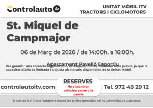 El dia 6 de març de 2026 la Unitat Mòbil ITV efectuarà les revisions als vehicles agrícoles (tractors i remolcs) i ciclomotros a la Plaça vestidors camp de futbol. L’horari del servei serà 14:00h a 16:00h.